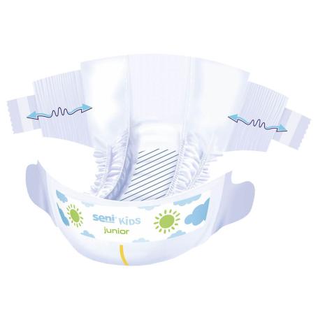 Für mittlere bis totale Harn- und Stuhlinkontinenz geeignet.Seni Kids Junior sind der perfekte Schutz für Kinder mit Inkontinenz, die aus herkömmlichen Babywindeln herausgewachsen sind und welchen die kleinsten Grössen von Super Seni zu gross sind. Anatomisch geformte Inkontinenzwindeln für mehr Komfort und sichere Passform. Mit seitlichen Klebeverschlüssen, welche sich zum mehrmaligen Öffnen und Schliessen eignen.